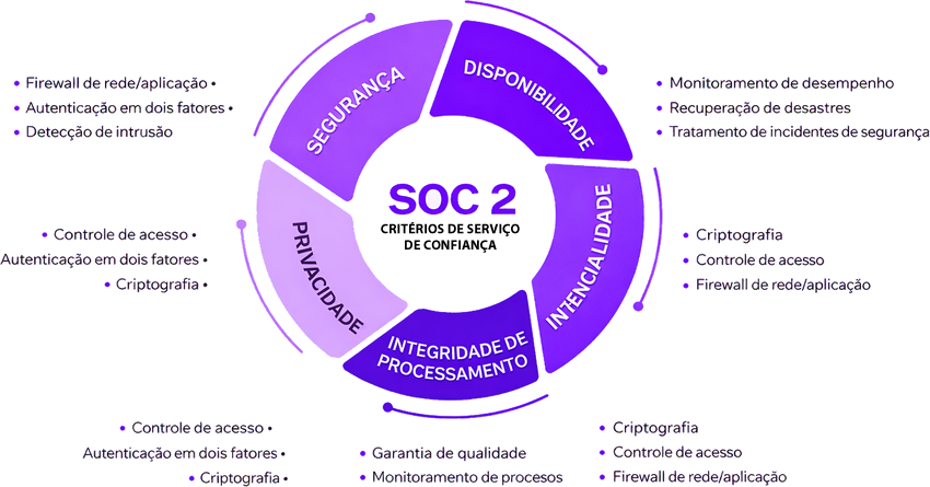 O SOC 2 é estruturado em torno de cinco categorias de critérios, sendo a Segurança obrigatória e as demais opcionais, conforme a natureza dos serviços prestados pela organização: