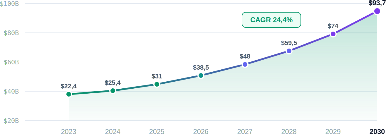 O mercado de IA aplicada à cibersegurança foi avaliado em US$ 25,35 bilhões em 2024 e deve alcançar US$ 93,75 bilhões até 2030, com uma taxa de crescimento anual composta (CAGR) de 24,4%, segundo a Grand View Research.